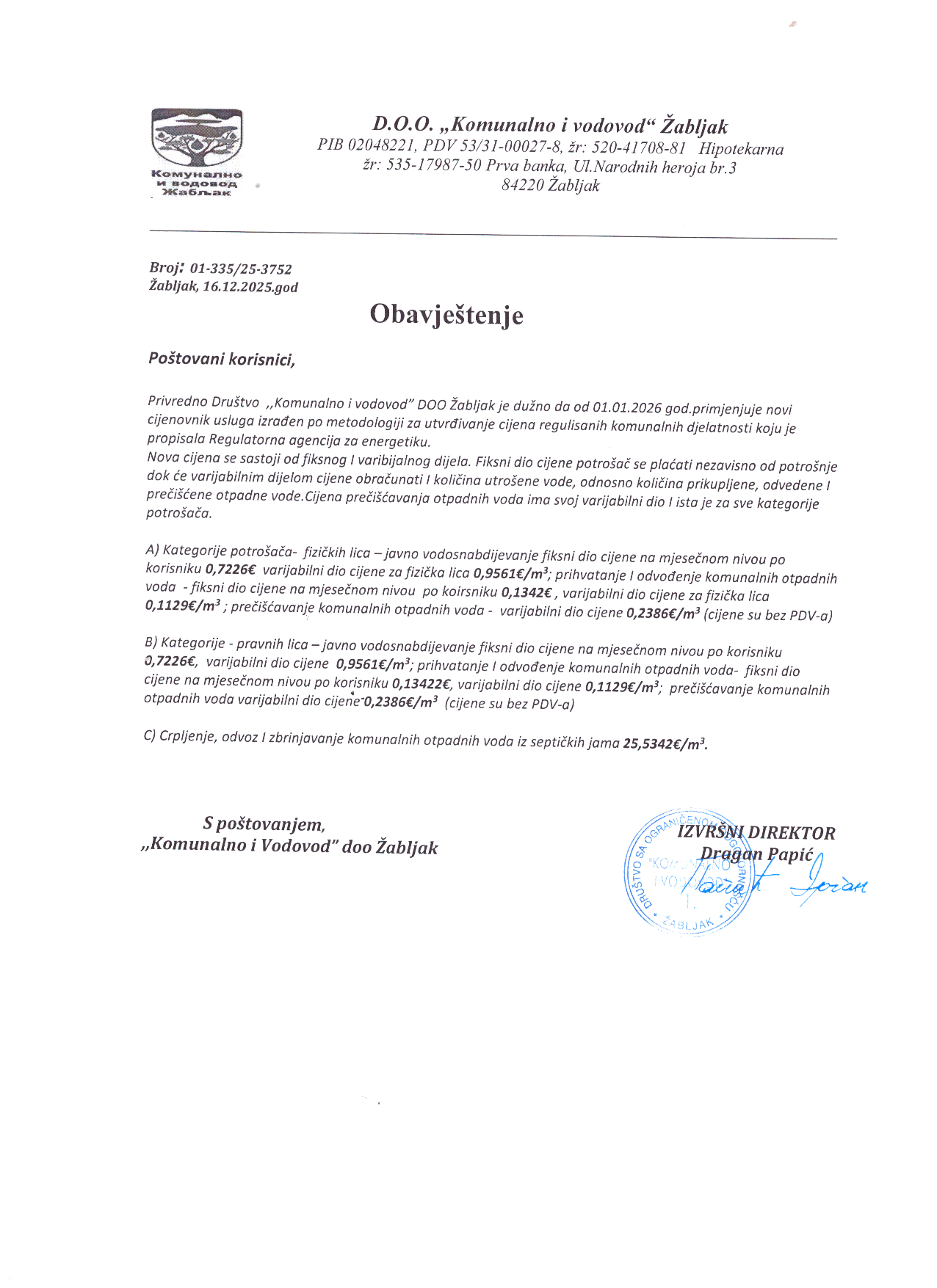 - Obavještenje o novom cjenovniku usluga za 2026. godinu